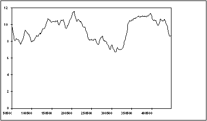 As we increase the size of the window 'w' we average out over a larger range of observations. This has the effect of progressively removing higher frequency components in the output parameter. Fig. 11.6 shows this applied to the data of example 11.6. You can see that if we use a window of w = 101 we are left only with the lowest frequencies.