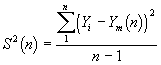 We could avoid the inefficiency of many replications if we could form an estimate of the variance of the mean from a single replication. The problem to be overcome is that near adjacent observations of Y are clearly correlated (e.g. large observations tend to be adjacent to other large observations etc.). We can solve this problem if we can assume that observations are covariance stationary, that is that the covariance between any two observations that are 'k' apart is the same where ever these observations are taken in the sequence. Assuming 'n' observations are left after removing the transient data we compute the sample mean, variance and covariances as follows :