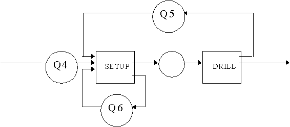 Q4 is a real queue where work pieces wait either for space on the drill or the availability of the operator. Likewise Q5 and Q6 are real queues in the sense that they represent the 'idle' status of drill and operator. The open circle however is an example of a dummy queue included essentially to maintain the alternating sequence of queues and activities. It is a dummy queue because the work piece will in fact move smoothly from the activity 'SETUP' to the activity 'DRILL' without pause.