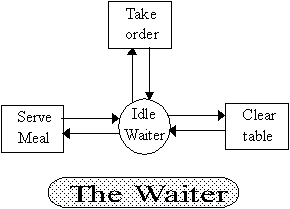 In the restaurant model the waiter, menu and table space reside permanently within the model. Customers arrive, order a meal, eat the meal, pay for the meal and depart.