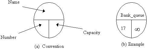 As you will soon discover when you construct an activity cycle diagram for a real world problem the diagram can easiliy become large, spread over several sheets and with activities being connected to many queues. In this situation an extension to the diagram convention can improve readability. Attaching labels to queues and activities will also aid transforming the diagram into a simulatable form. For queues a convenient convention is shown in Fig. 3.7