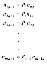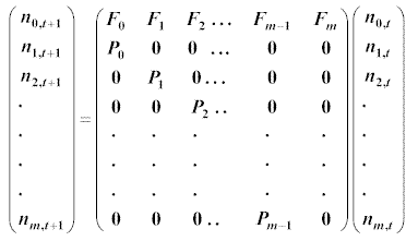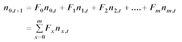 We can now use the above definitions to build the initial model. Firstly, we establish relationships giving us the numbers of females in each age group at time t+1. Take the lowest age group first, the number of members in this group is given by: